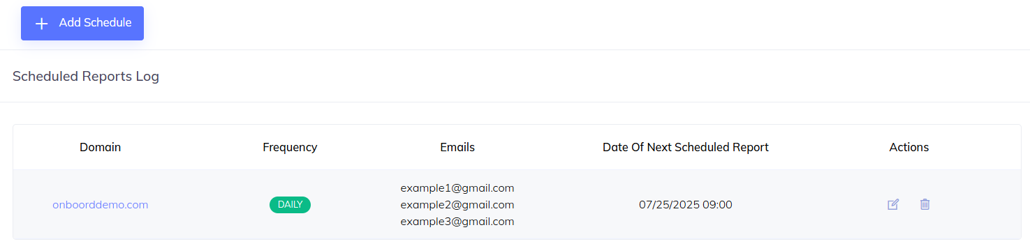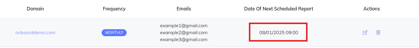 Vous pouvez consulter vos rapports programmés sur la plate-forme avec les critères que vous avez choisis, tels que le nom de domaine, la fréquence, l'adresse électronique enregistrée à laquelle vous souhaitez que ces rapports soient envoyés, la date à laquelle vous devez recevoir votre prochain rapport programmé et les actions.