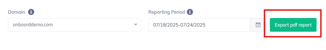 Vous pouvez non seulement programmer l'envoi de vos rapports PDF par courriel de temps à autre, mais aussi les générer à la demande. Tout ce que vous avez à faire est de sélectionner votre domaine, de choisir votre période de rapport (plage de dates pour laquelle vous voulez voir les résultats de votre rapport DMARC) et de cliquer sur Exporter au format PDF :