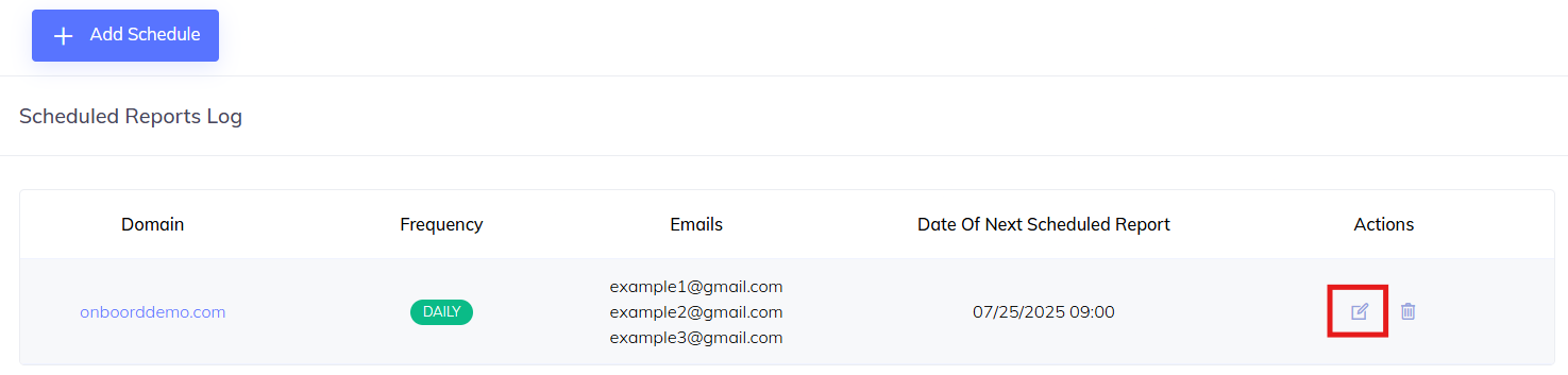 Vous pouvez modifier directement votre rapport programmé et choisir une fréquence ou une adresse électronique différente en cliquant sur l'icône de modification sous Actions :