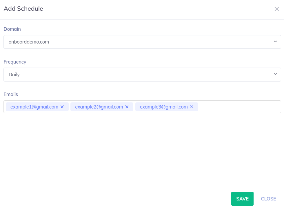 La boîte de dialogue Add Schedule apparaît. Saisissez le domaine pour lequel vous souhaitez programmer vos rapports PDF, sélectionnez la fréquence de réception de ces rapports (quotidienne, hebdomadaire, mensuelle, annuelle), ajoutez l'adresse électronique à laquelle vous souhaitez que ces rapports soient envoyés et cliquez sur Enregistrer.