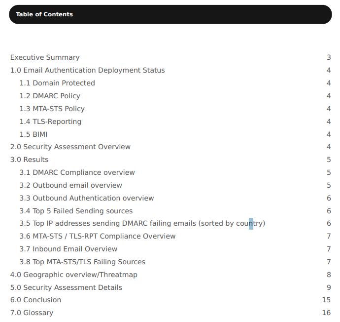 En tant que propriétaire de domaine, vos rapports DMARC PDF sont un excellent moyen de visualiser la conformité DMARC globale de votre domaine et le flux d'e-mails, d'évaluer vos résultats d'authentification SPF, DKIM et DMARC et d'analyser les menaces relatives à votre domaine. Il vous offre une visibilité complète de votre domaine de messagerie grâce à des données présentées de manière très organisée et systématique, faciles à comprendre pour un public technique et non technique. Vous trouverez ci-dessous la table des matières d'un rapport PDF DMARC, qui vous donnera une idée de ce que vous pouvez voir exactement grâce à ces rapports :