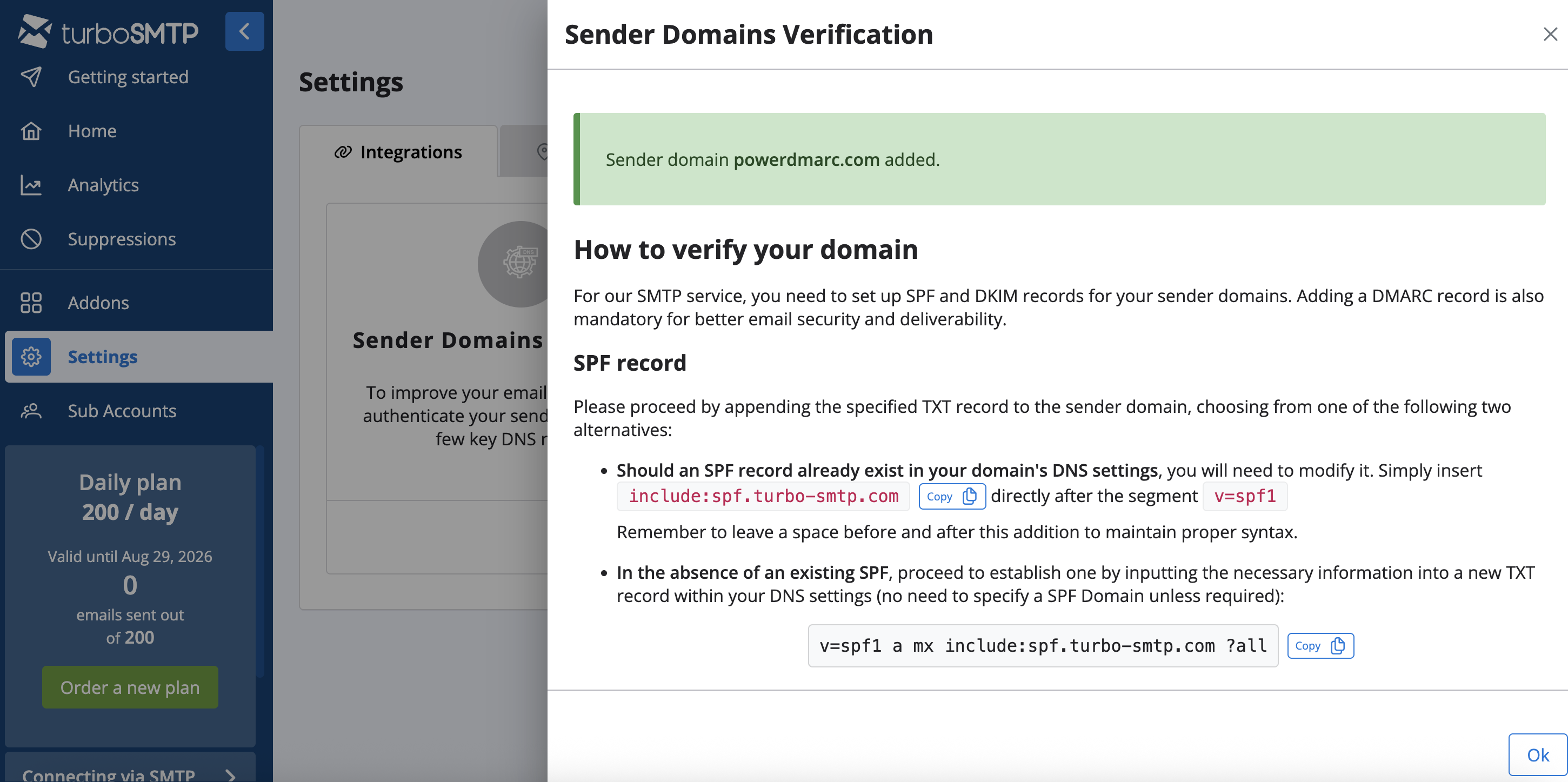 TurboSMTP affichera maintenant les enregistrements SPF nécessaires.