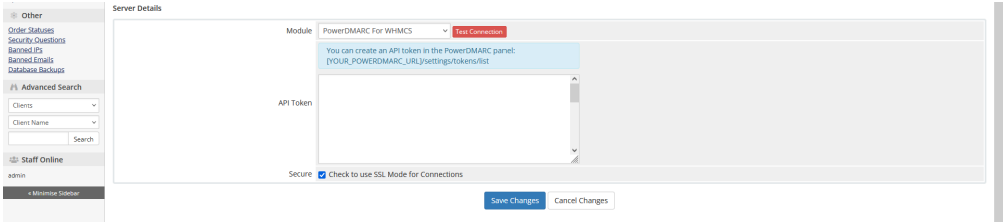 Dans la section "Server Details", sélectionnez "PowerDMARC For WHMCS" dans le champ "Module".