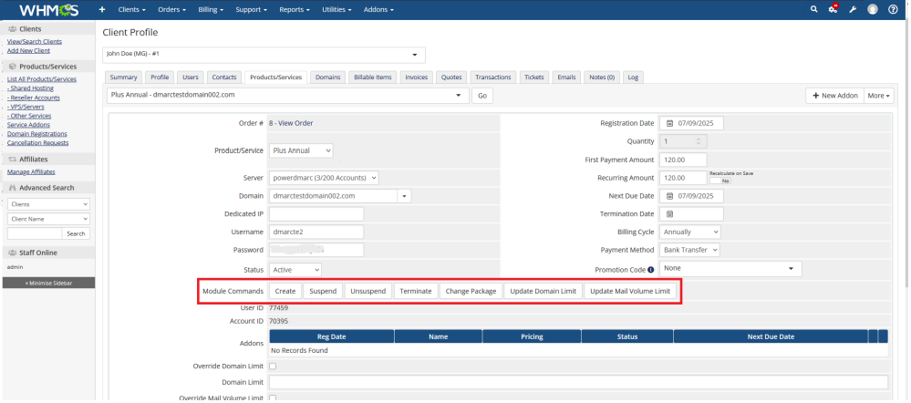 Une fois le service créé, vous pouvez le gérer dans la section du profil du client dans l'onglet Produits/Services.