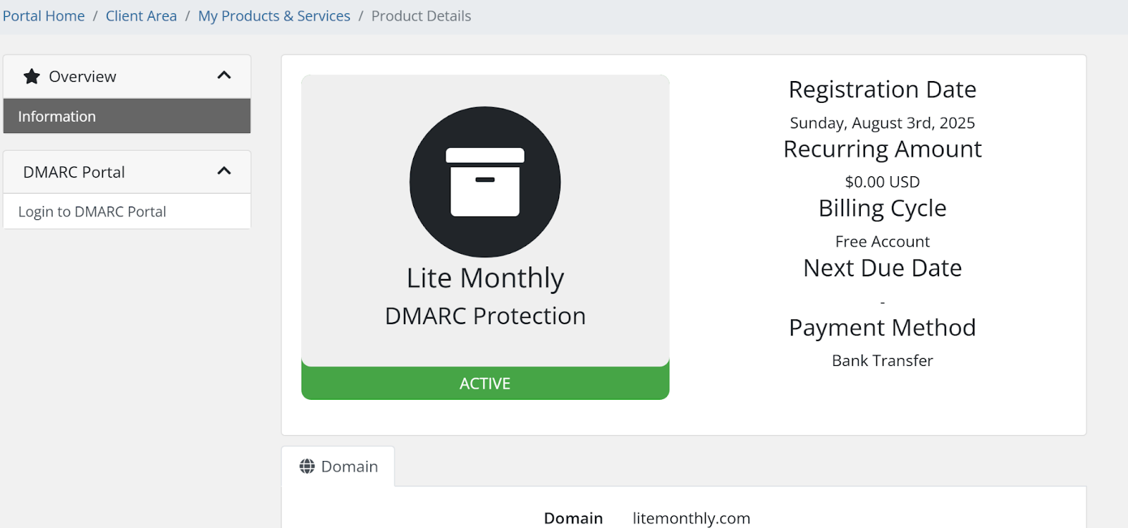 La vue du panneau de contrôle de l'utilisateur final WHMCS affiche des informations de base sur l'achat du service et permet de se connecter en un seul clic au portail du partenaire PowerDMARC.