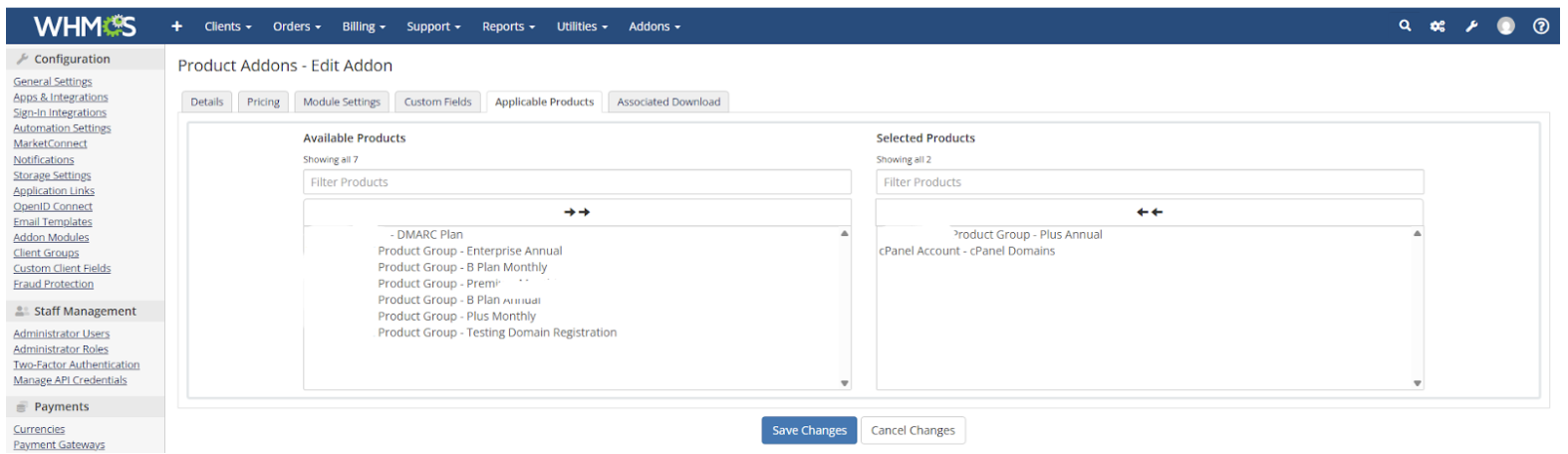 Après avoir créé l'addon, vous pouvez vous rendre dans la section "Produits applicables" et ajouter les produits concernés. Ex. DMARC en tant que module complémentaire pour SSL.