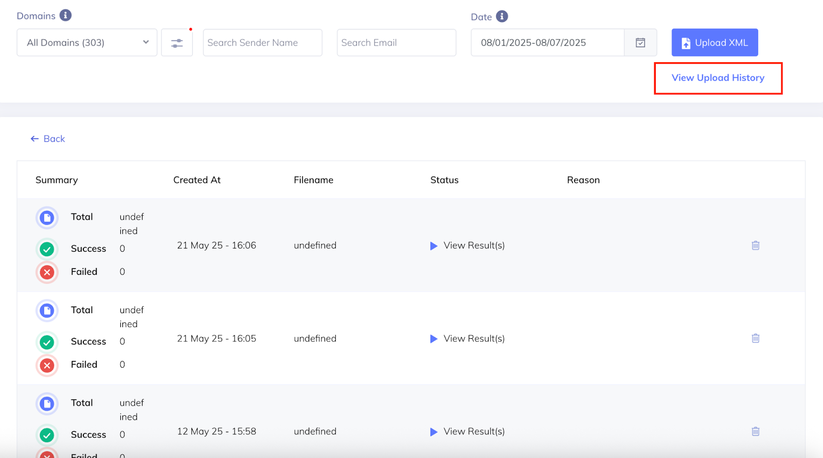 Dans le menu Afficher l'historique des téléchargements vous trouverez un résumé de tous les fichiers XML DMARC que vous avez téléchargés, y compris le nombre total d'enregistrements, le nombre d'enregistrements traités avec succès et ceux qui ont échoué. Vous pouvez également supprimer les téléchargements précédents directement à partir de cette vue.