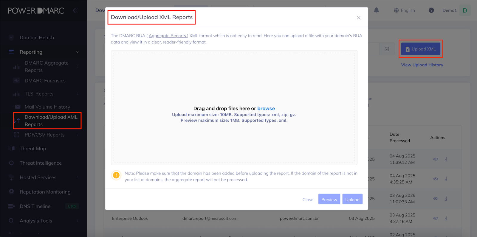 Remarque importante : Assurez-vous que le domaine figurant dans le rapport a déjà été ajouté à votre compte PowerDMARC. Si ce n'est pas le cas, le rapport téléchargé ne sera pas traité.